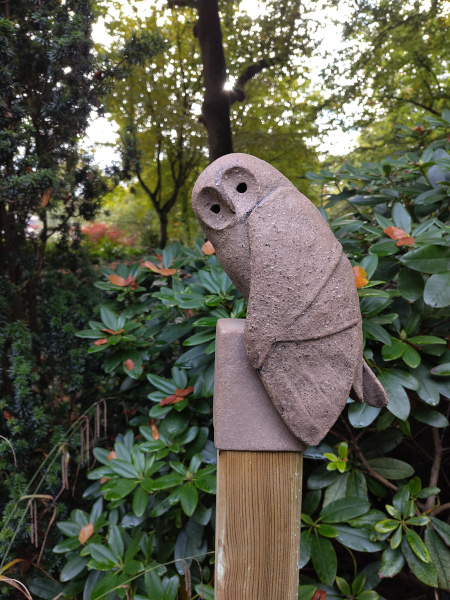 De installatie van de velduilen bestraat uit een groep van drie uilen en een groep van vijf uilen.