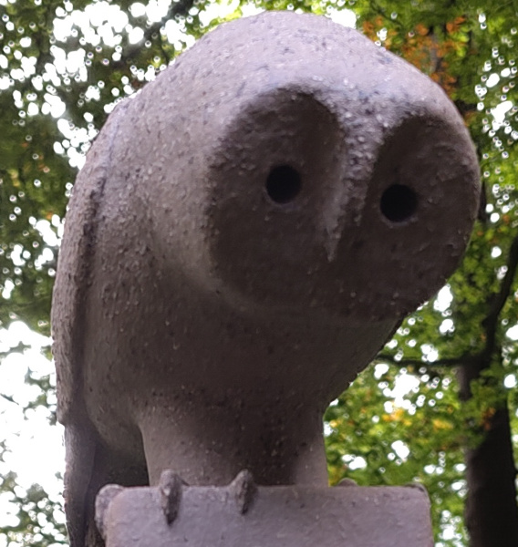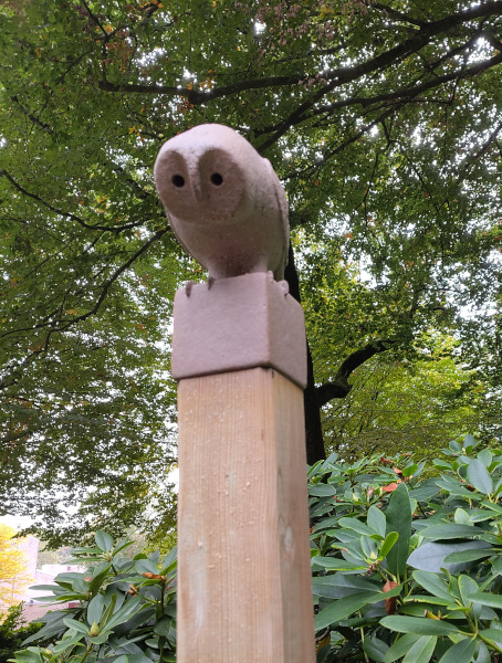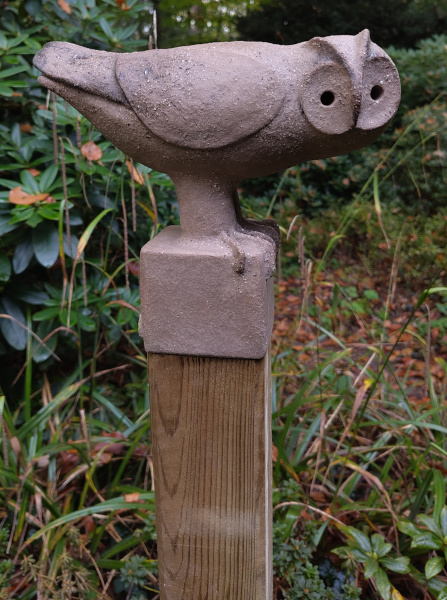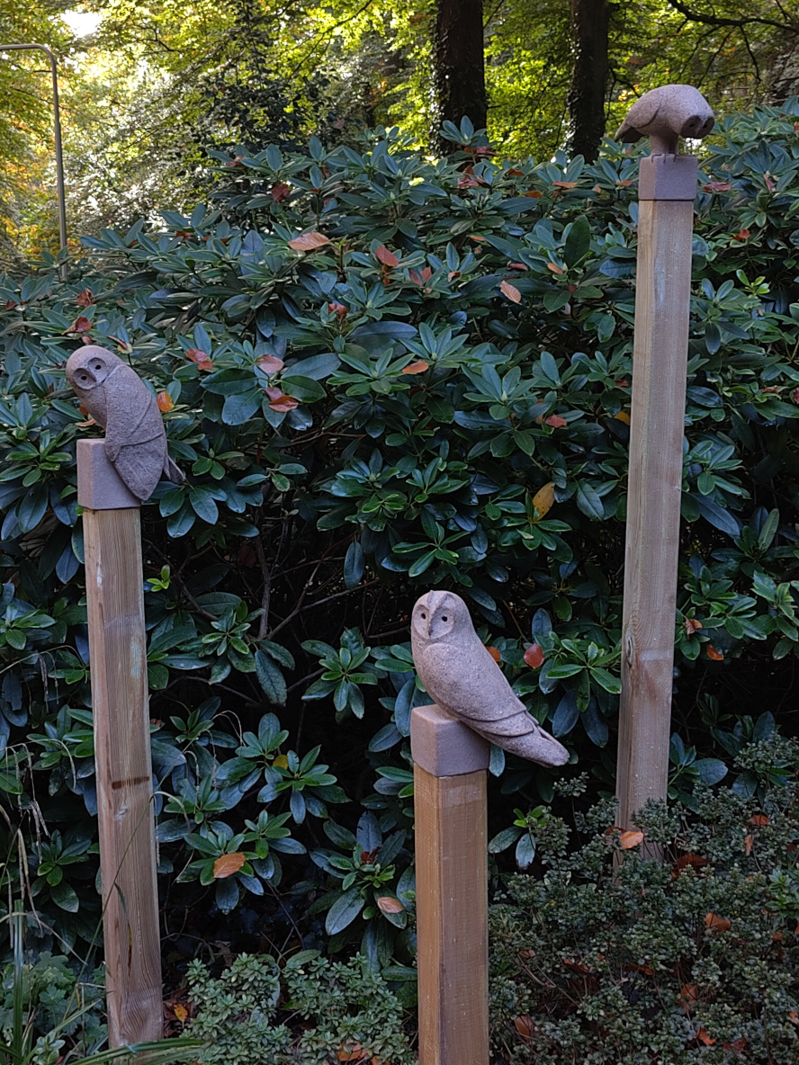 De installatie van de velduilen bestraat uit een groep van drie uilen en een groep van vijf uilen.